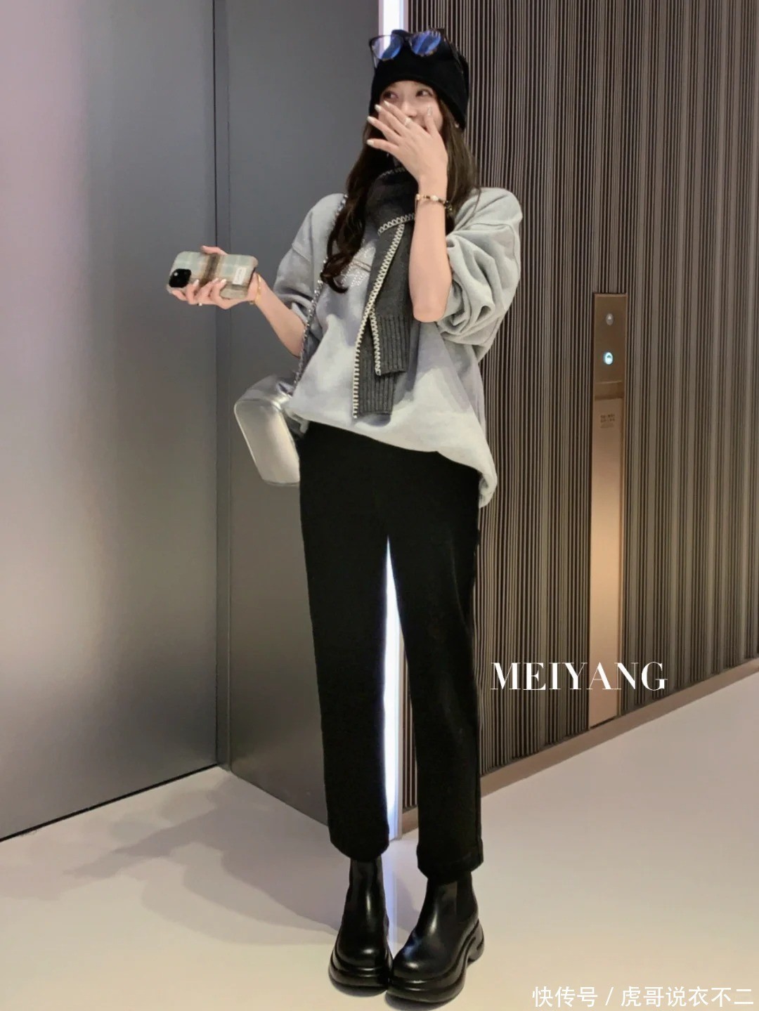 周末出街的舒适之选。选择做旧感的浅灰卫衣,搭配黑色烟管裤时,用黑色短靴过渡。将裤脚卷起露出脚踝,搭配中筒棉袜增加层次感。这种"上宽下窄"的搭配既能藏起小腹赘肉,又通过脚踝处的露肤减轻沉闷感,适合苹果型身材。