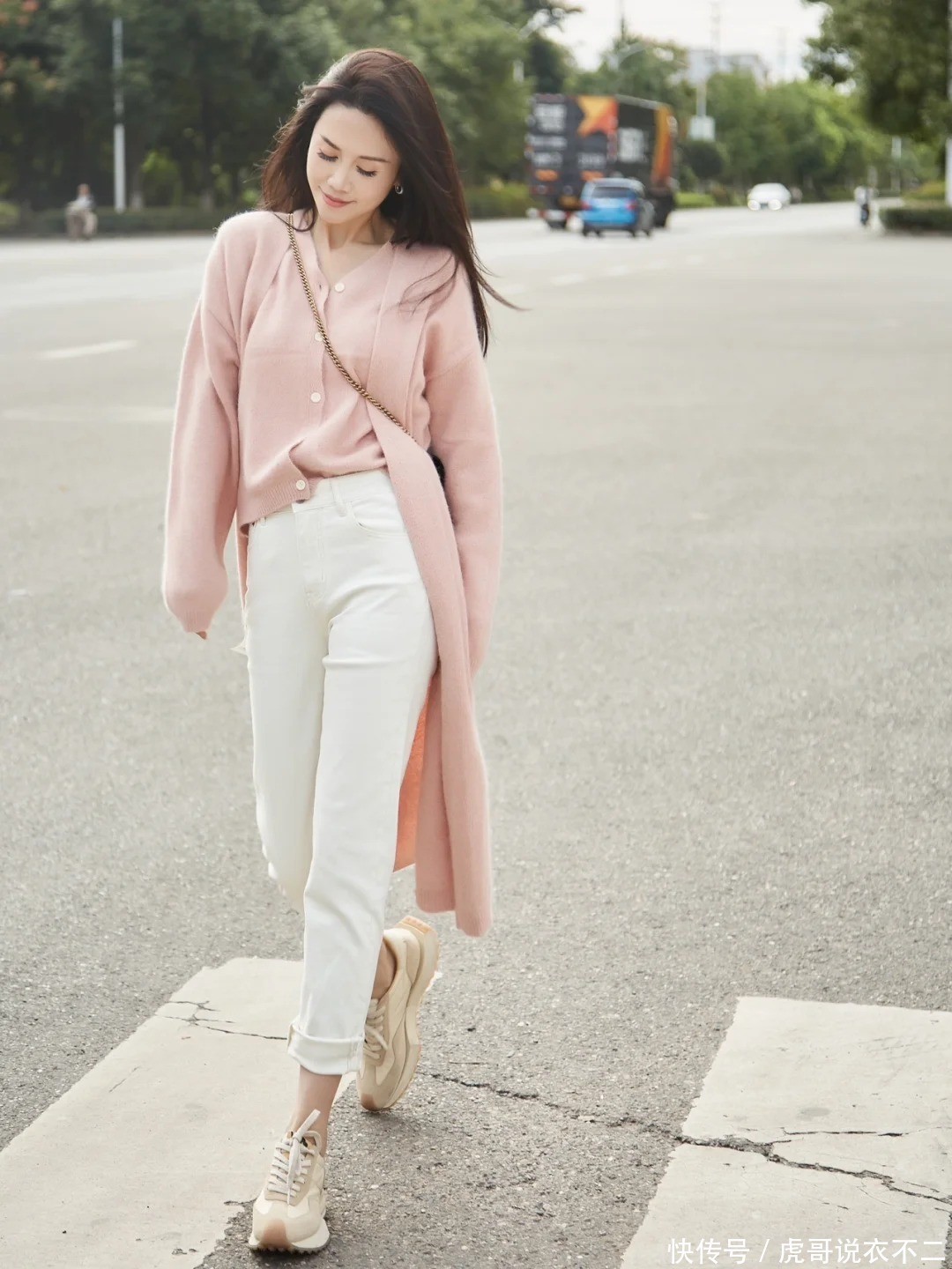 选择莫兰迪粉长款针织开衫,内搭同色打底,下装搭配白色烟管裤。这种"长+短"的搭配法既能修饰胯部线条,又通过露肤度平衡拖沓感。用链条包和运动鞋增加度假感,适合周末约会或下午茶。