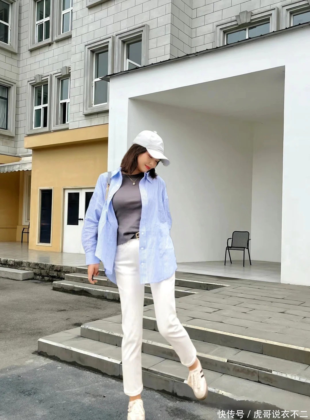 这种亮色系搭配可以内搭一件深色打底,也能打破沉闷感。搭配白色烟管裤时,建议选择九分长度,露出纤细脚踝,搭配同色系德训鞋,显瘦效果翻倍。