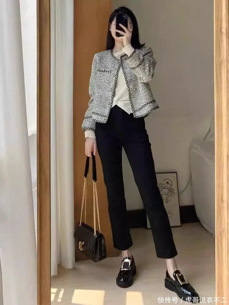将优雅刻进DNA的组合。灰色粗花呢短外套搭配黑色烟管裤,内搭纯色打底衫就可以了。可以选择黑色乐福鞋呼应裤装,这种"上短下长"的搭配特别适合小个子女生,既能优化比例,又通过混搭材质展现穿搭功力。