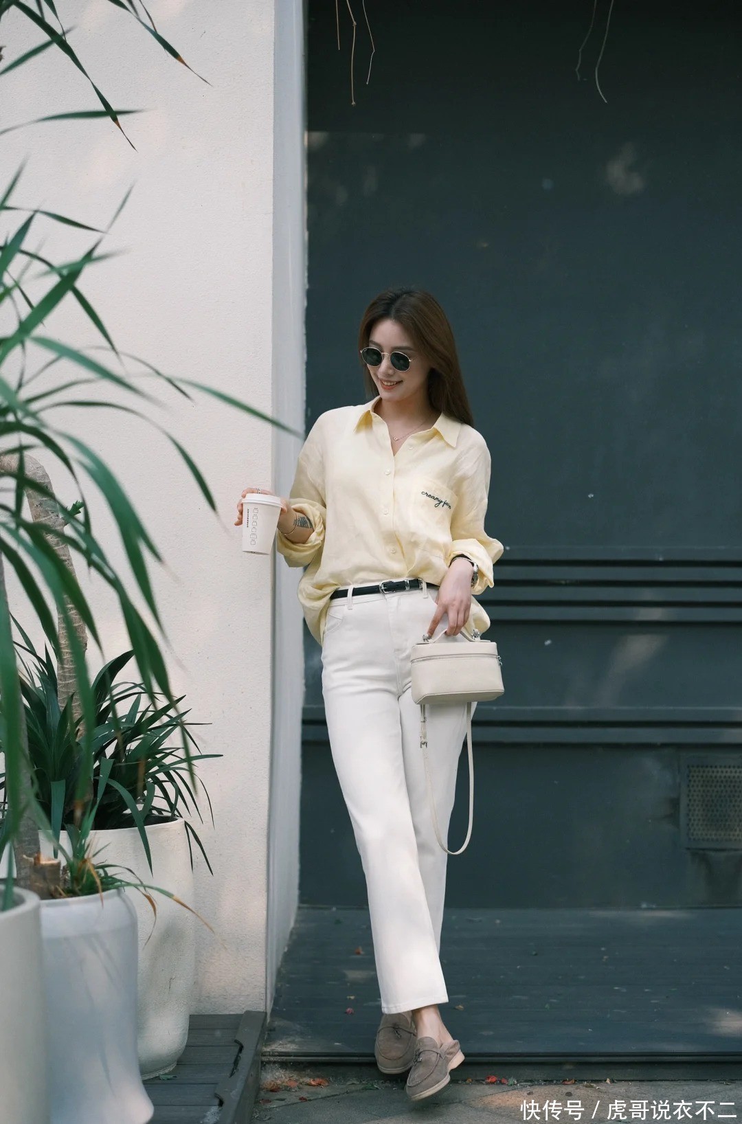 一、白色烟管裤:清新通勤的万能单品搭配1:淡黄色衬衫+白色烟管裤