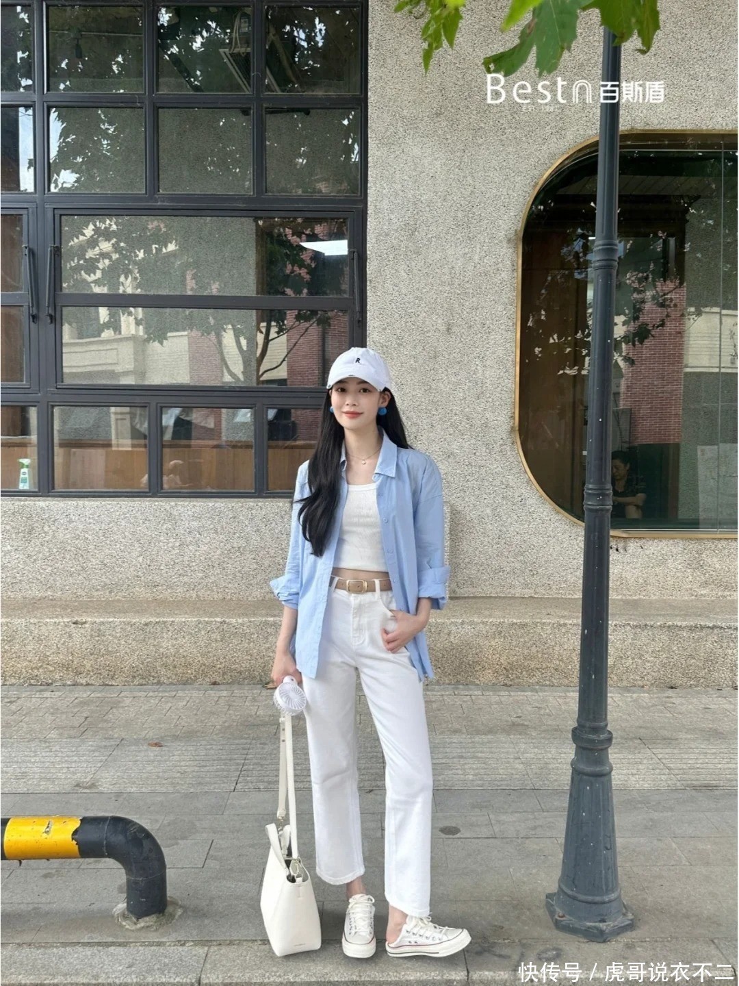 搭配2:浅蓝叠穿组合+白色烟管裤