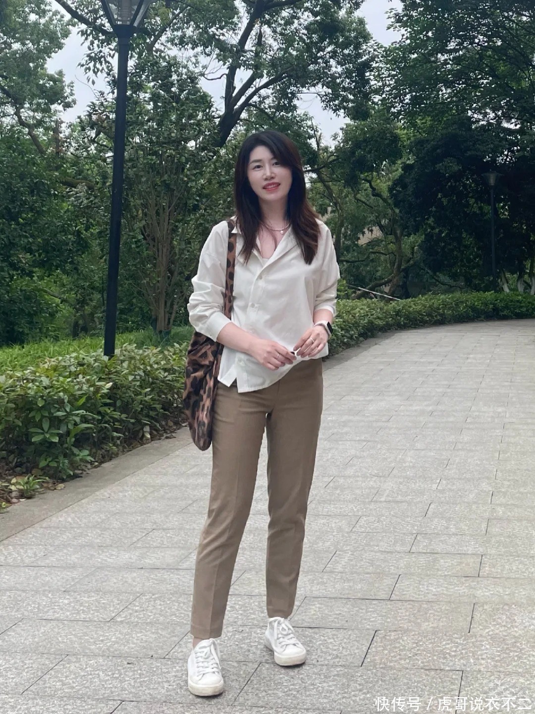 经典不过时的职场王炸组合。选择挺括的府绸白衬衫,可以选择不对称设计的衬衫,袖口卷至肘部露出手表。卡其色烟管裤选择高腰设计,搭配白色运动鞋,简约又高级,整套look既有大女主气场,又带着克制的高级感。