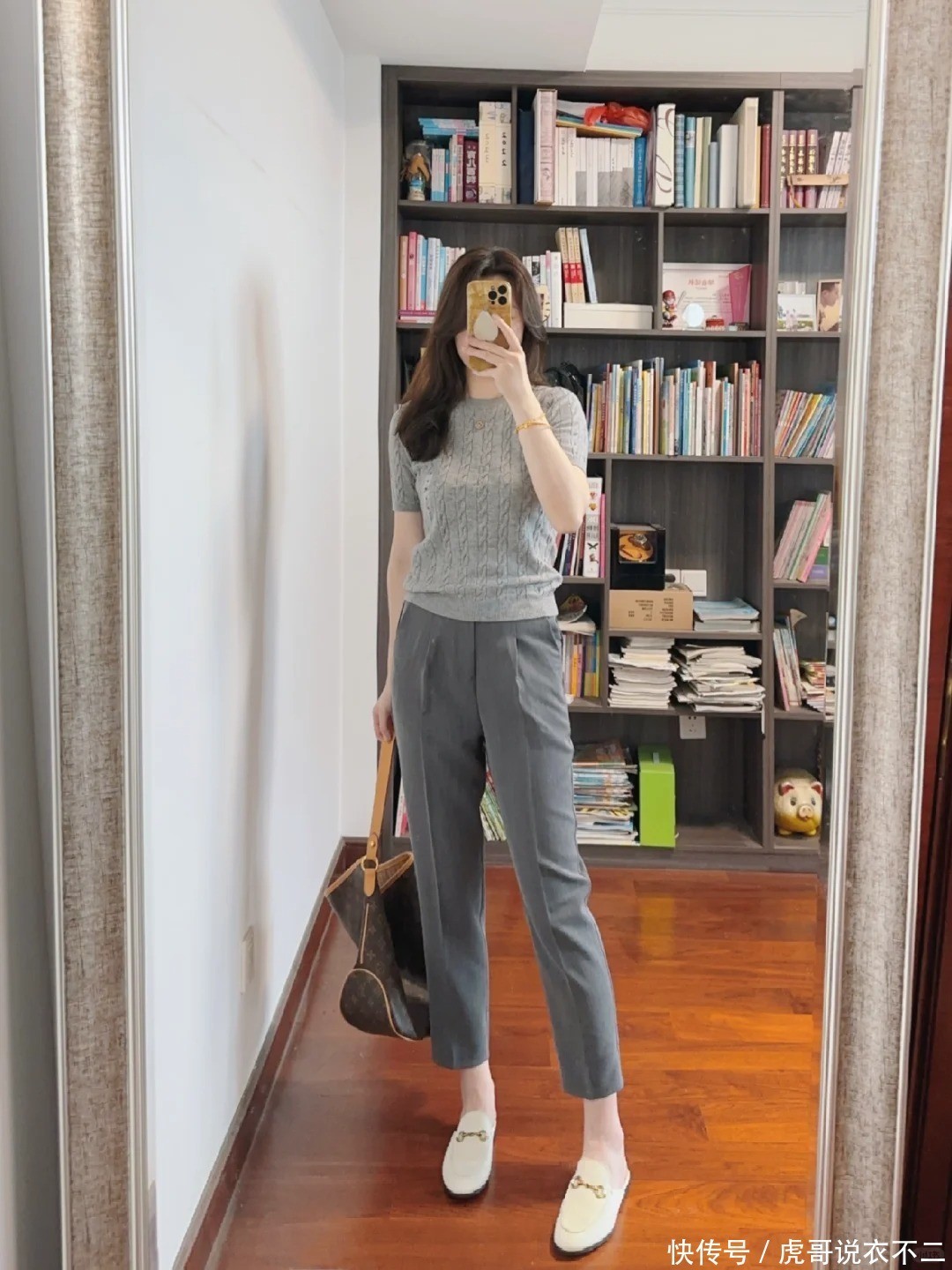 想要穿出"显贵"效果?尝试全身灰调搭配。浅灰短袖针织衫搭配深灰烟管裤,选择带有肌理的针织面料,搭配白色乐福鞋,这种同色系不同深浅的搭配,既能纵向拉长身形,又通过面料差异打造层次感。特别适合需要出席重要场合的轻熟女性。